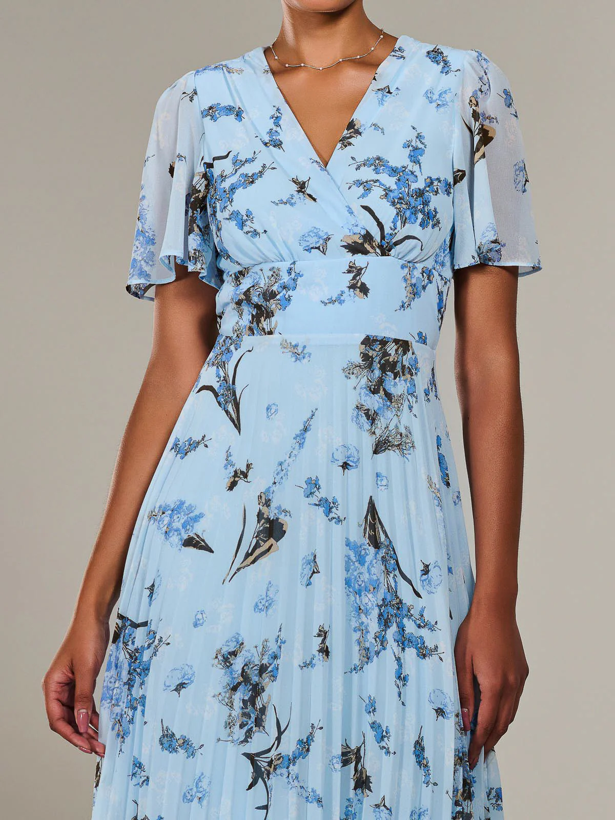 Angel Sleeve Pleated Chiffon Maxi Dress, Blue Multi