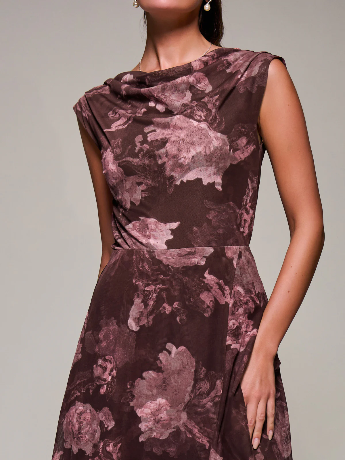 Asymmetrical Draped Mesh Midaxi Dress Burgundy Abstract