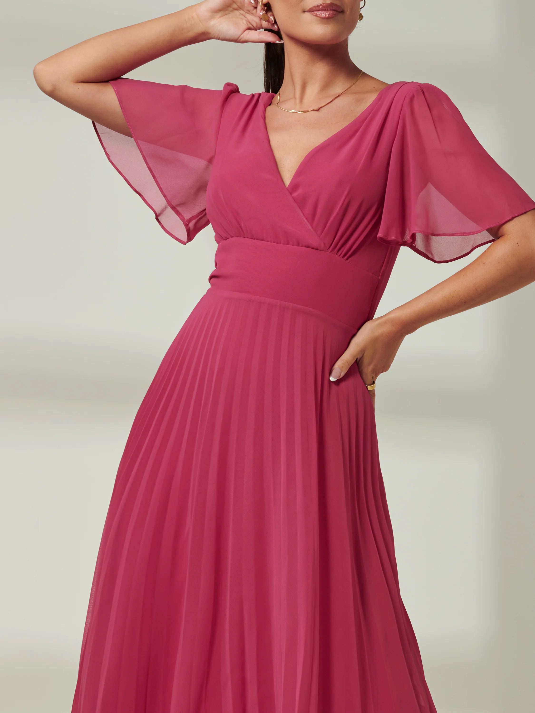 Elene Pleated High Low Chiffon Maxi Dress, Fuchsia Pink