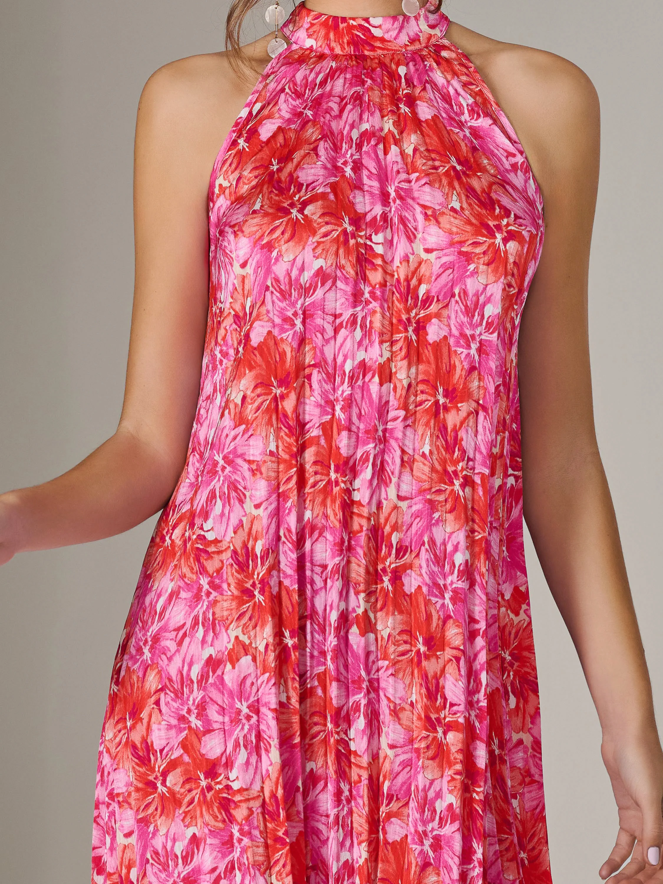 Halter Neck Pleated Maxi Dress, Pink Multi