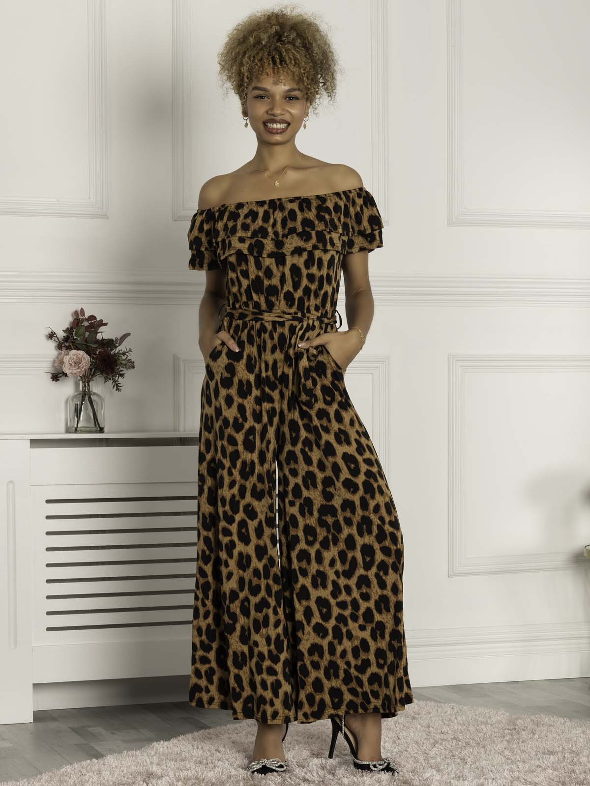 Feminine and fun, this printed off-the-shoulder jersey jumpsuit from Jolie Moi offers an easy-going silhouette. It's made from a premium jersey fabric with an all-over animal print and features a stretchy Bardot neckline with ruffle detailing. The elasticated waistline with a self-tie belt adds definition before flowing down into wide-leg trousers.