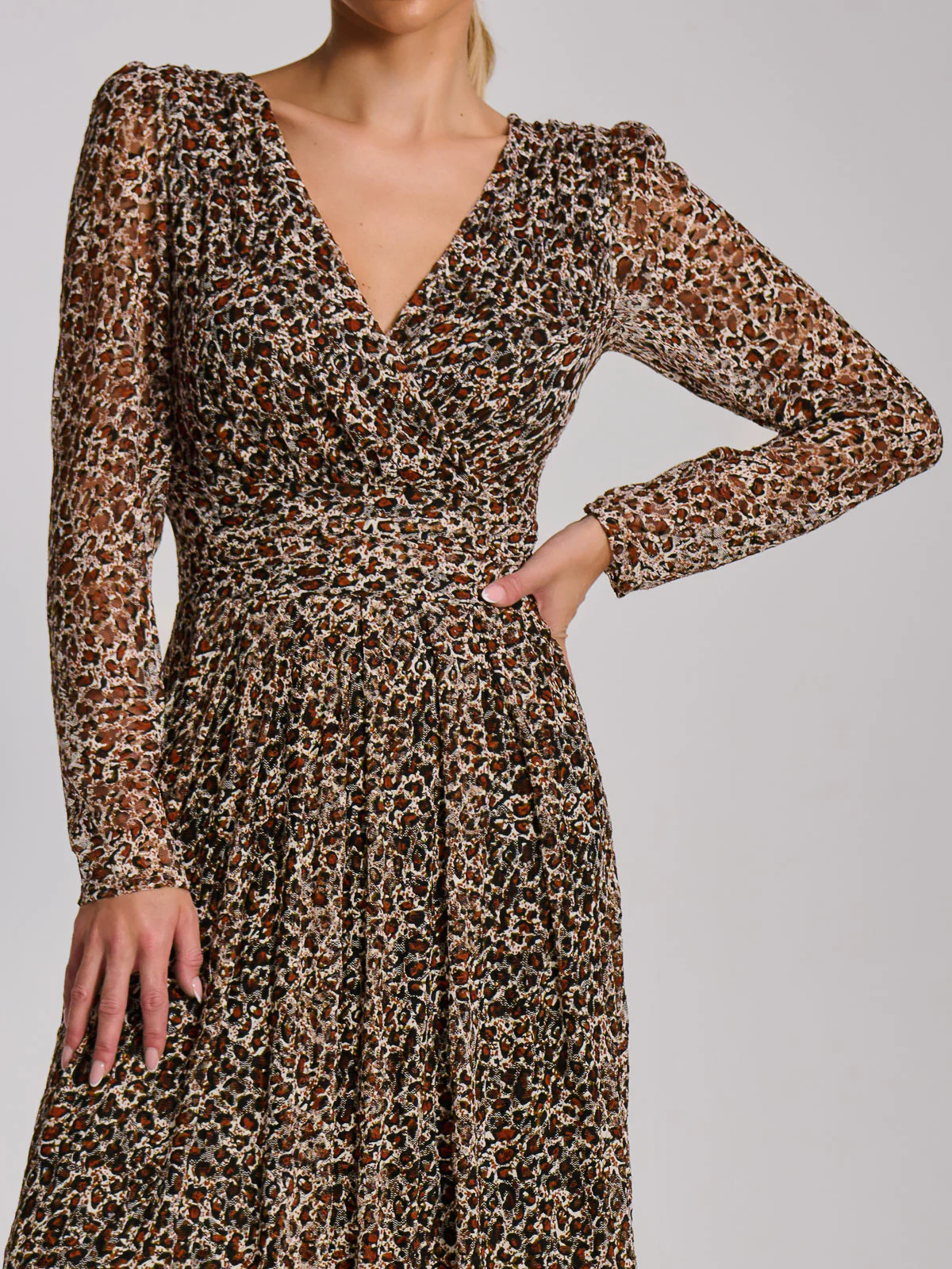 Long Sleeve Pleated Lace Maxi Dress, Neutral Animal