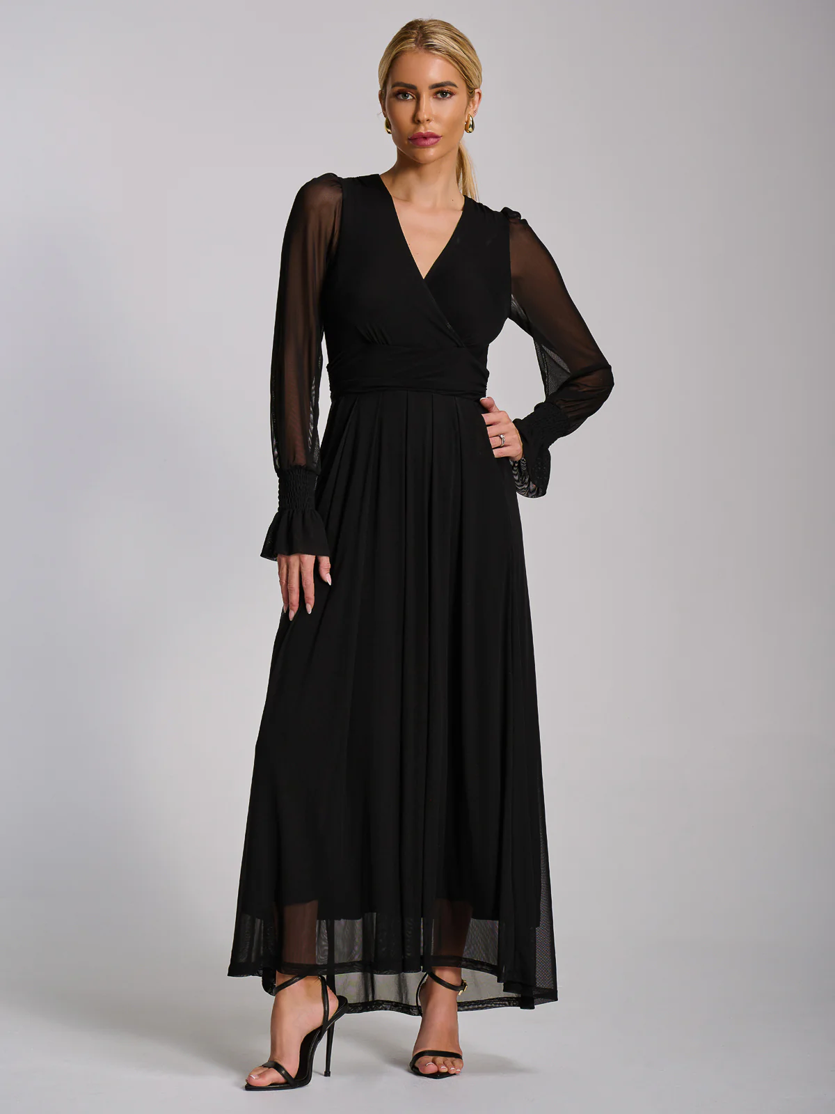The Mesh Sleeve Maxi Dress from Jolie Moi. This elegant maxi dress is made from delicate mesh, featuring a wrap V-neckline and long sheer sleeves with shirred, flared cuffs. A thick waistband with a back tie fastening accentuates the waist, while the fully lined design ensures comfort and the discreet pockets add practicality. The pleated skirt completes the look, adding graceful movement. Perfect for formal occasions or evening events.