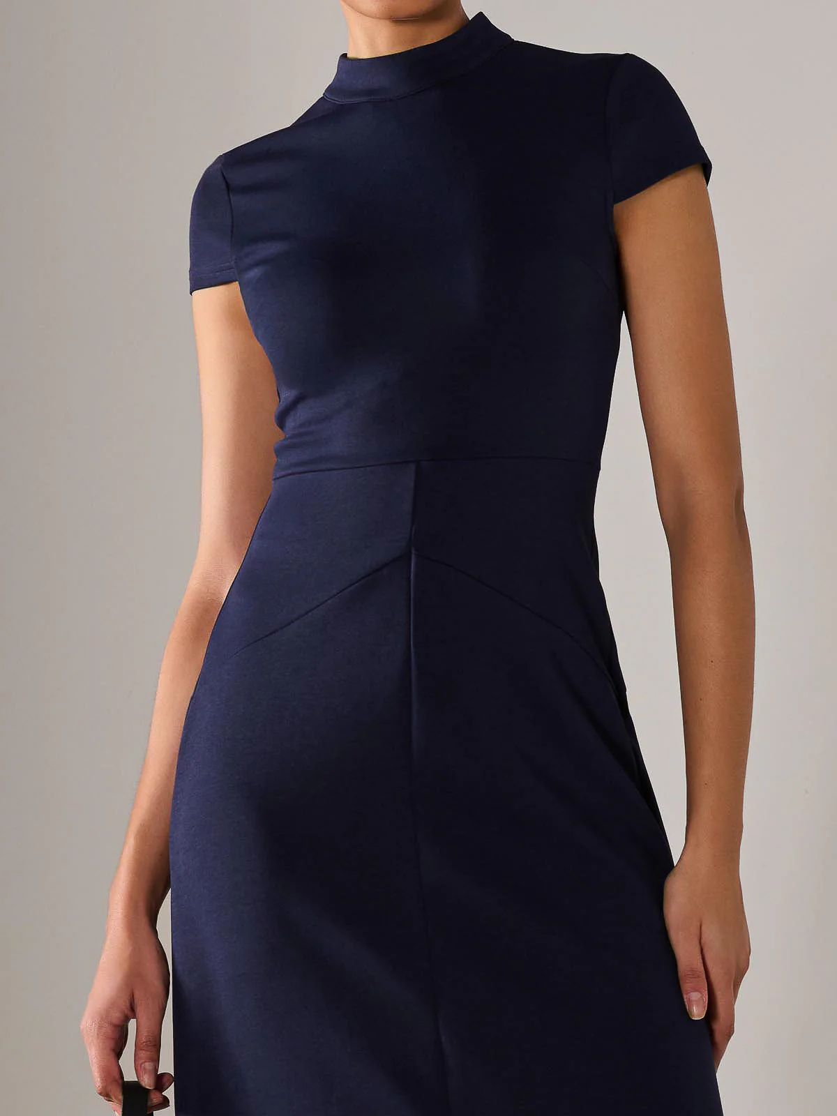 Effortlessly transition from the office desk to dinner with a form-fitting Ponte Cap Sleeve Midi Dress by Jolie Moi. This chic style features flattering seams, a high neckline with double button accents, and a sleek zip fastening.