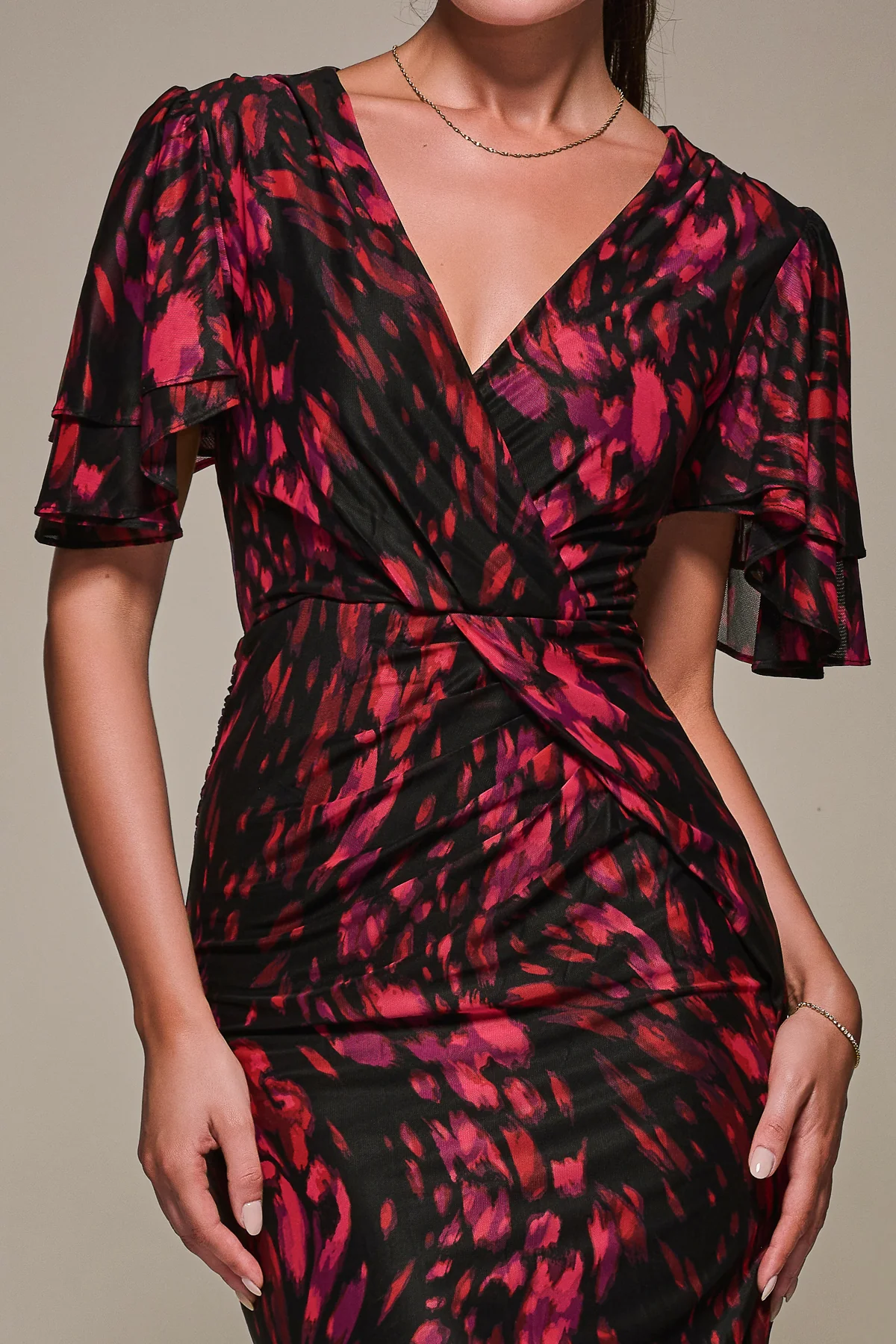Feel beautiful in our Print Mesh Angel Sleeve Dress, crafted from soft airy mesh fabric adorned in a gorgeous print, flattering the body perfectly due to its bodycon silhouette. The pleated waist detailing and double layered ruffle sleeves add an elegant touch to this midi dress, with a gorgeous v neckline and soft jersey lining for extra comfort. Perfect for any occasion, this dress is easy to wear with a concealed zip at the back.Â