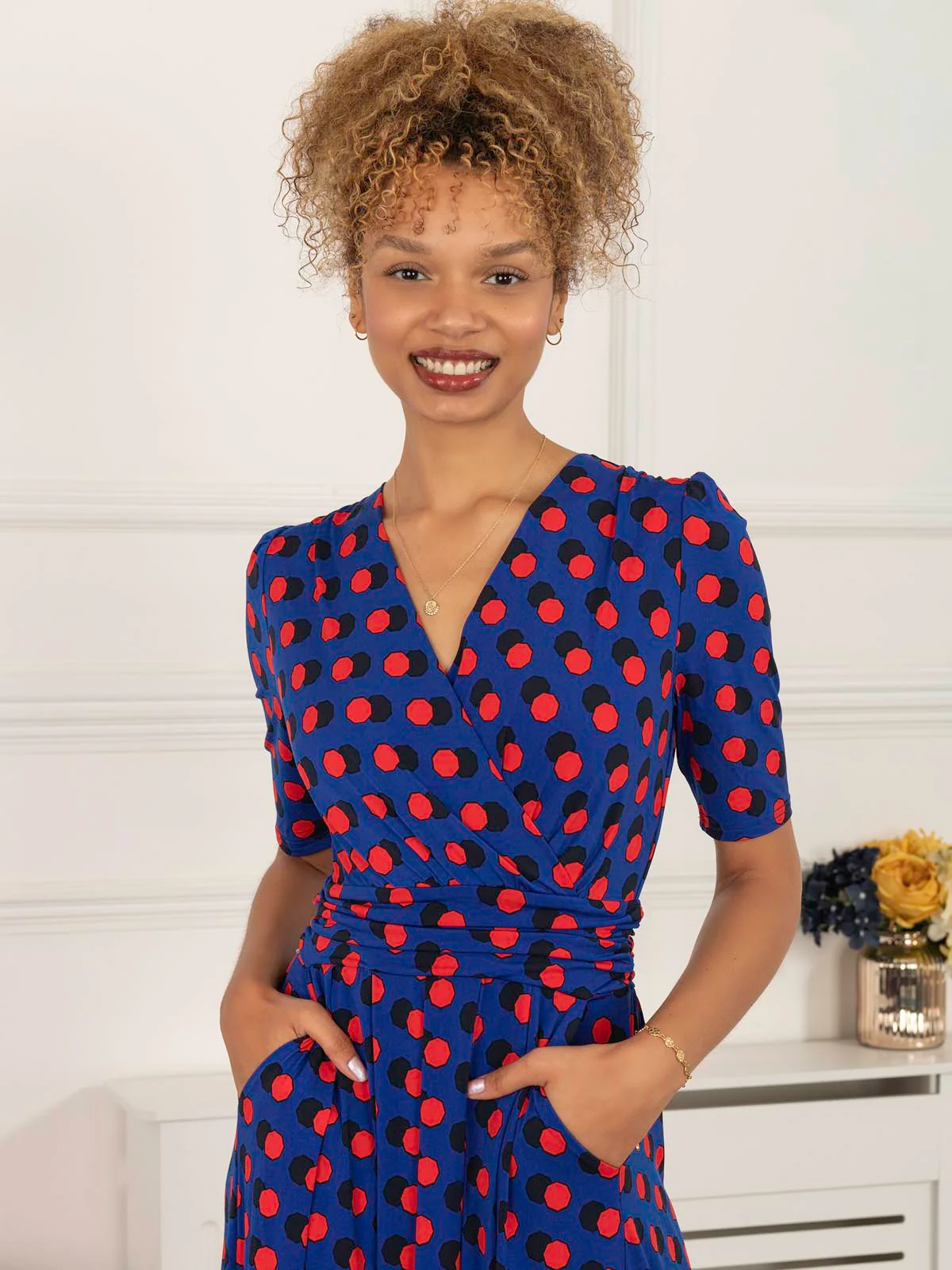 This dress from Jolie Moi makes an impact with its striking polka dot print and flowing maxi hem. Cut from soft and stretchy jersey fabric for long-lasting comfort, the cross-over V-neck runs into a ruched elasticated waistband that draws in your silhouette for a form-flattering shape. Finished with side pockets for easy wear, pair with anything from canvas trainers to sleek point-toe heels.