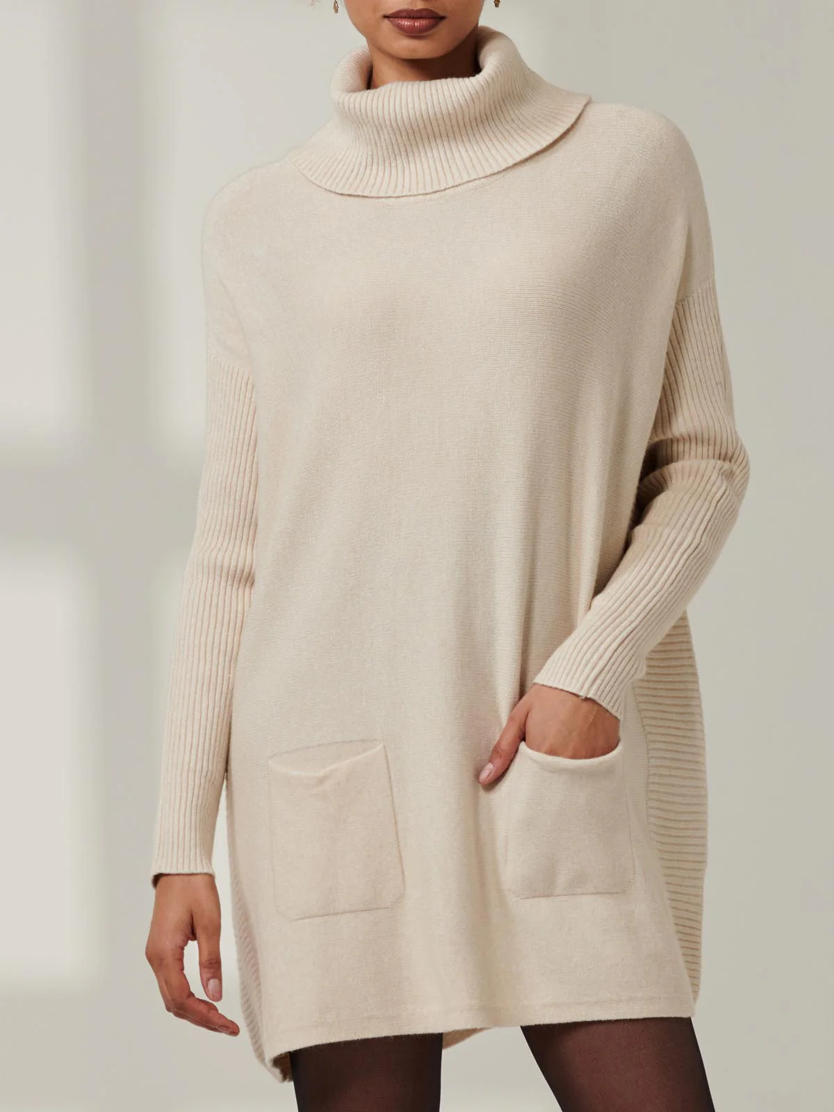 Roll Neck Pocket Front Knit Jumper, Beige Heather
