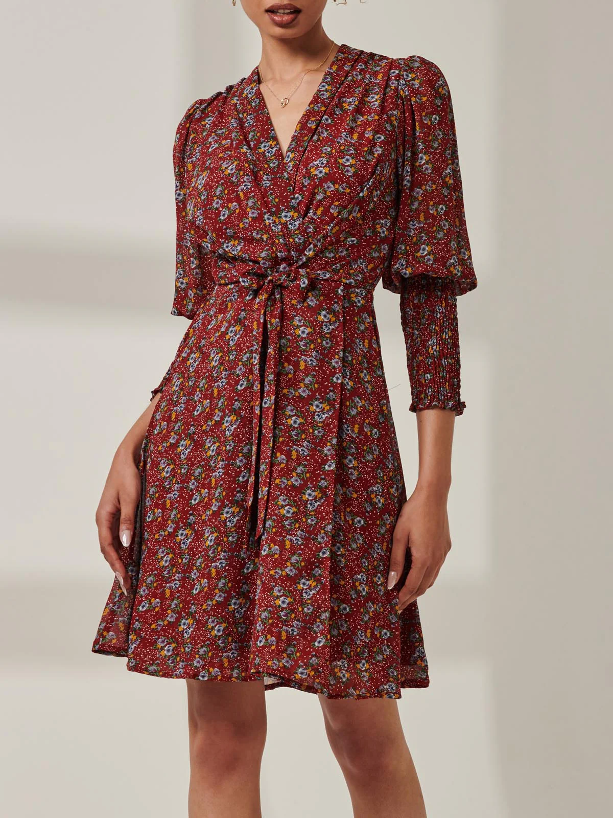 Shirred Cuff Tie Waist Dress, Burgundy Multi