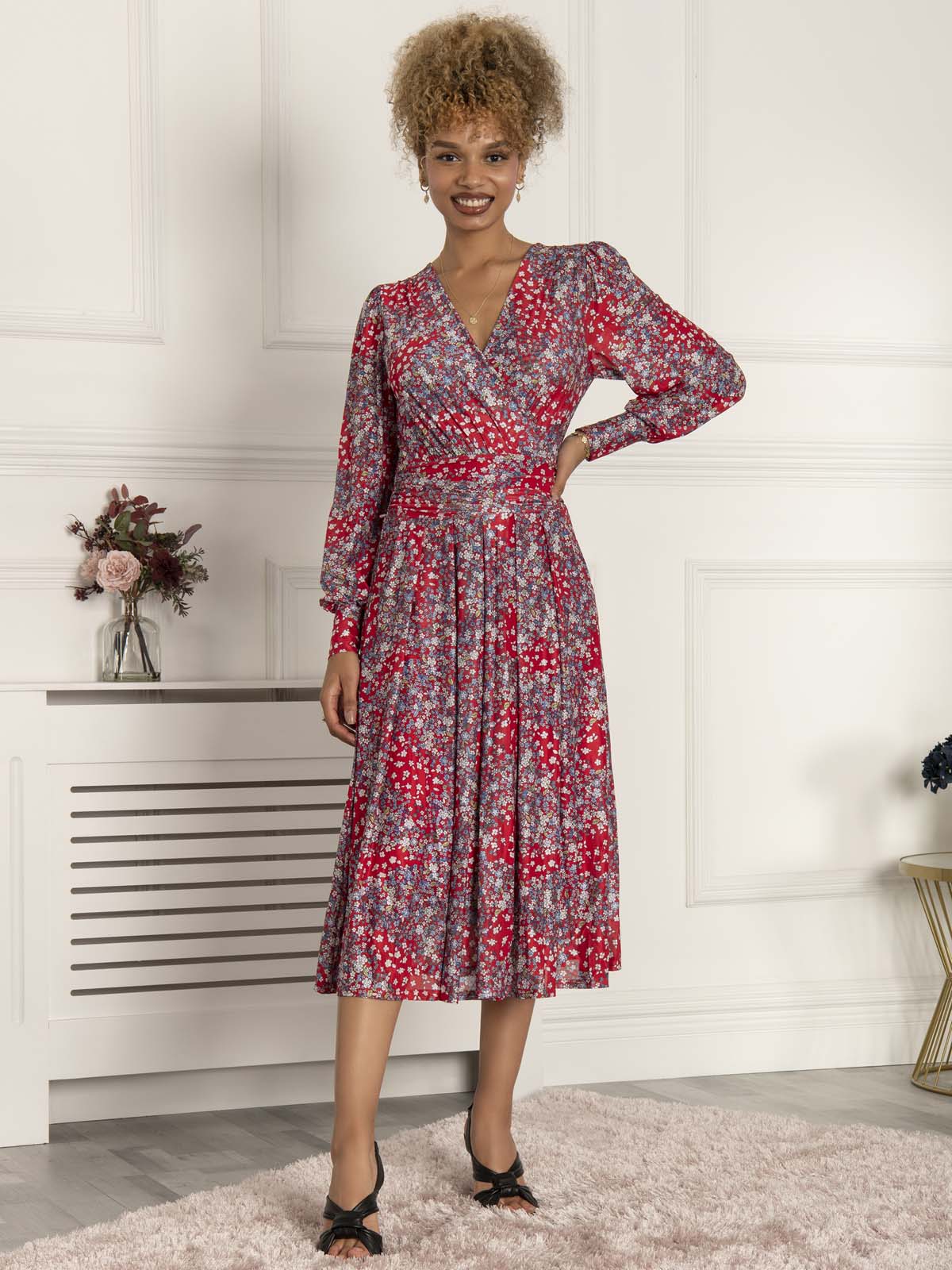 Vanessa Long Sleeve Mesh Midi Dress, Red Floral
